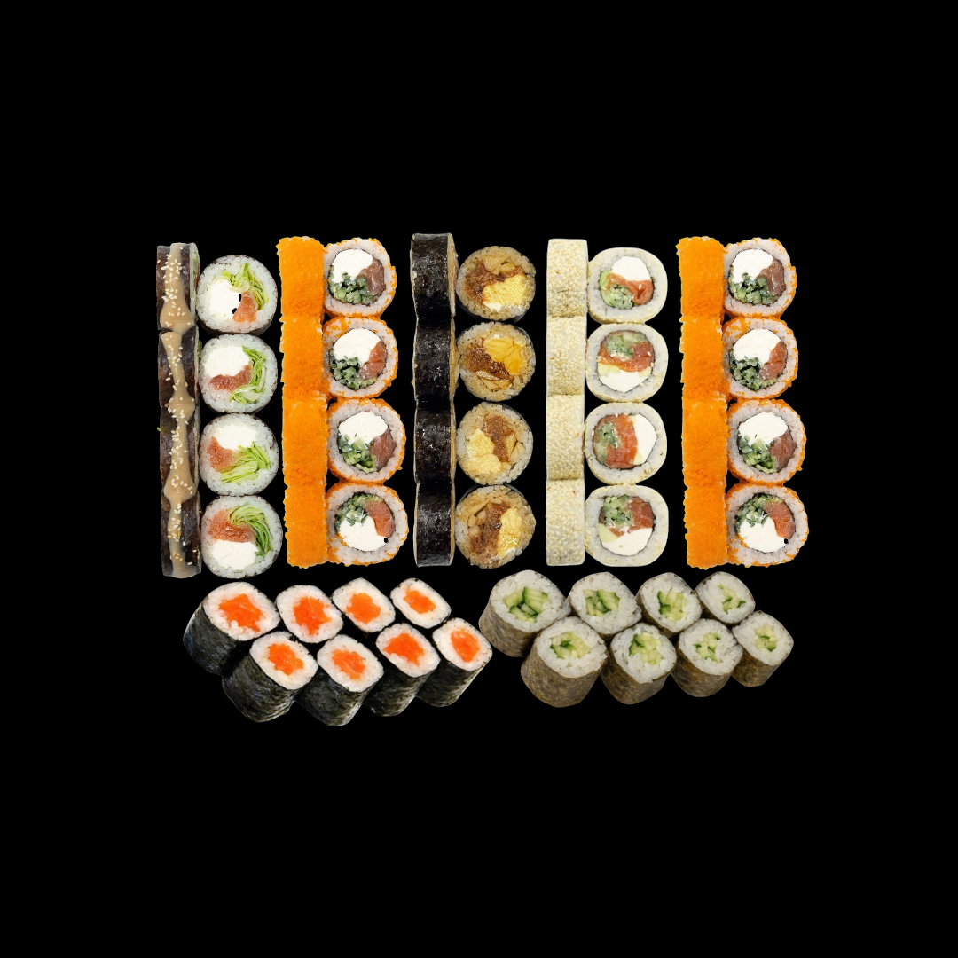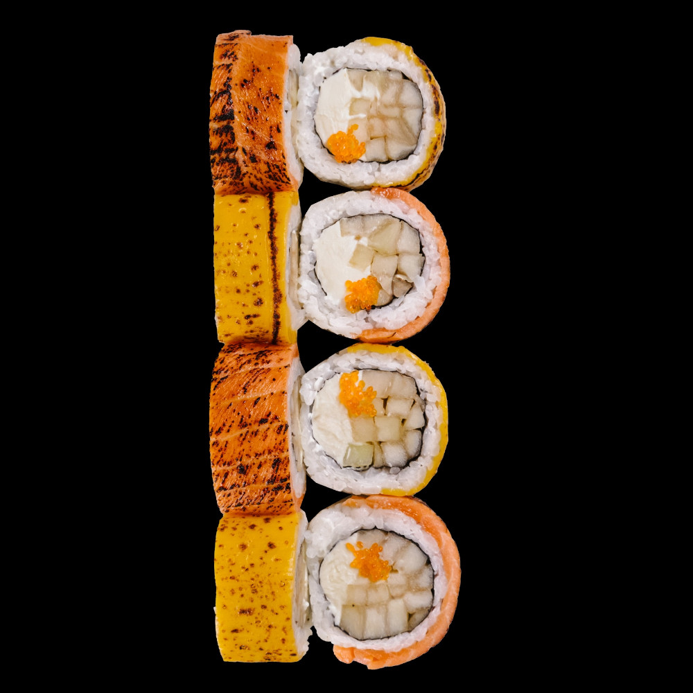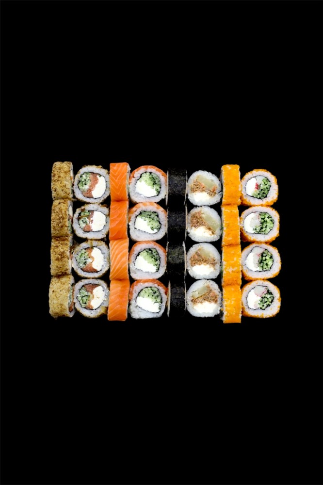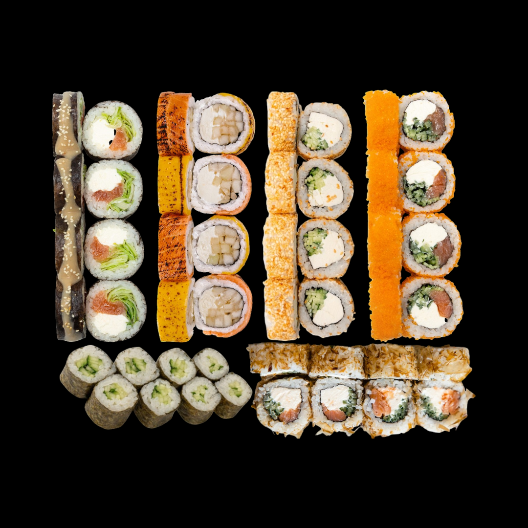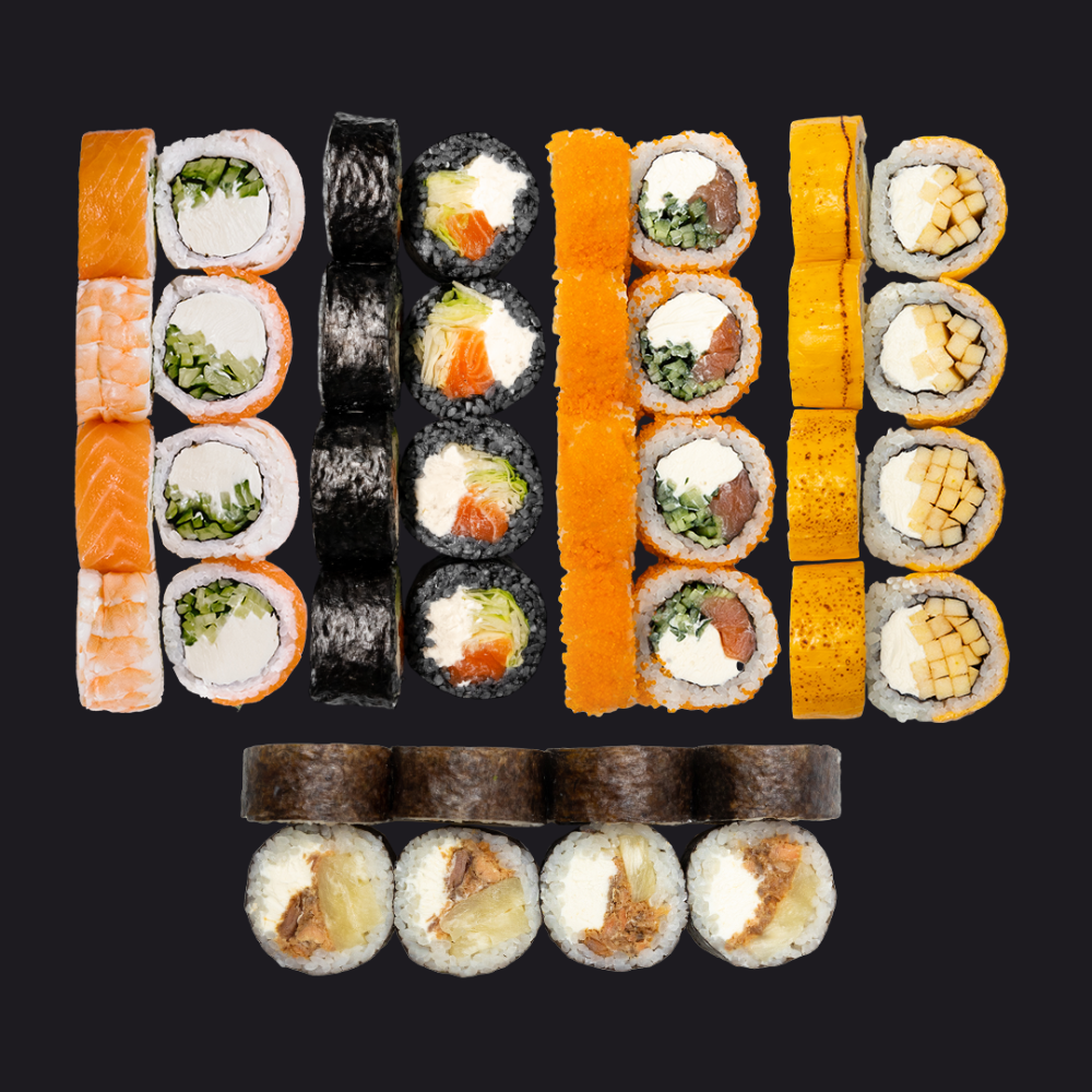 1. Філадельфія мікс креветка 2. Футомак Блек з лососем 3. Філадельфія в ікрі з лососем 4. Чедер груша5. Футомак з лососем теріякі та ананасом