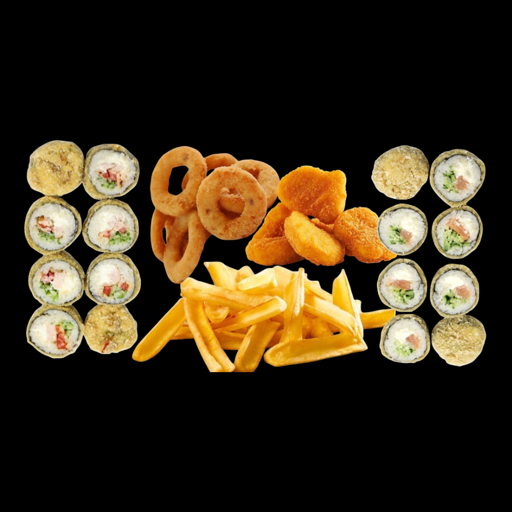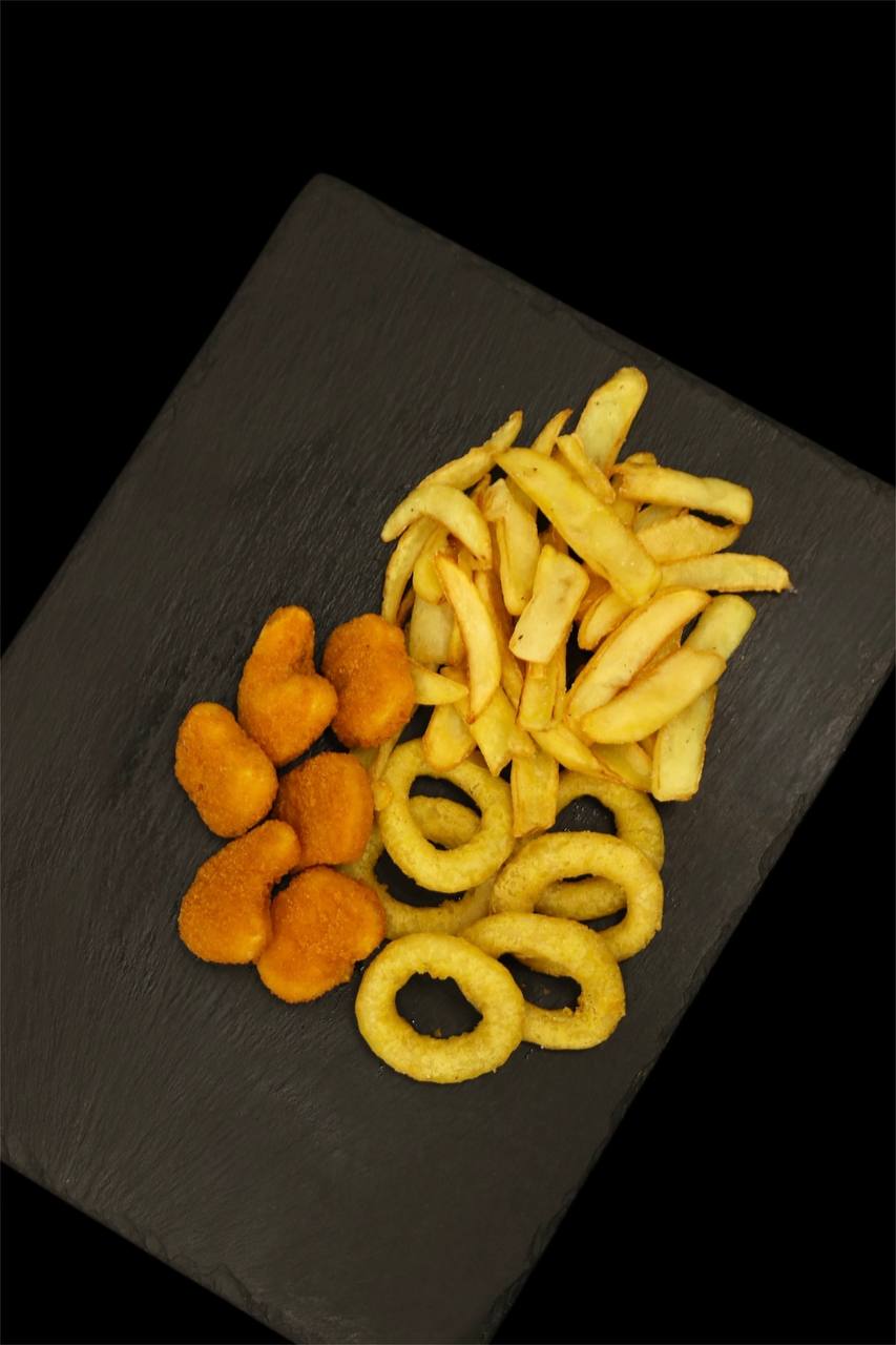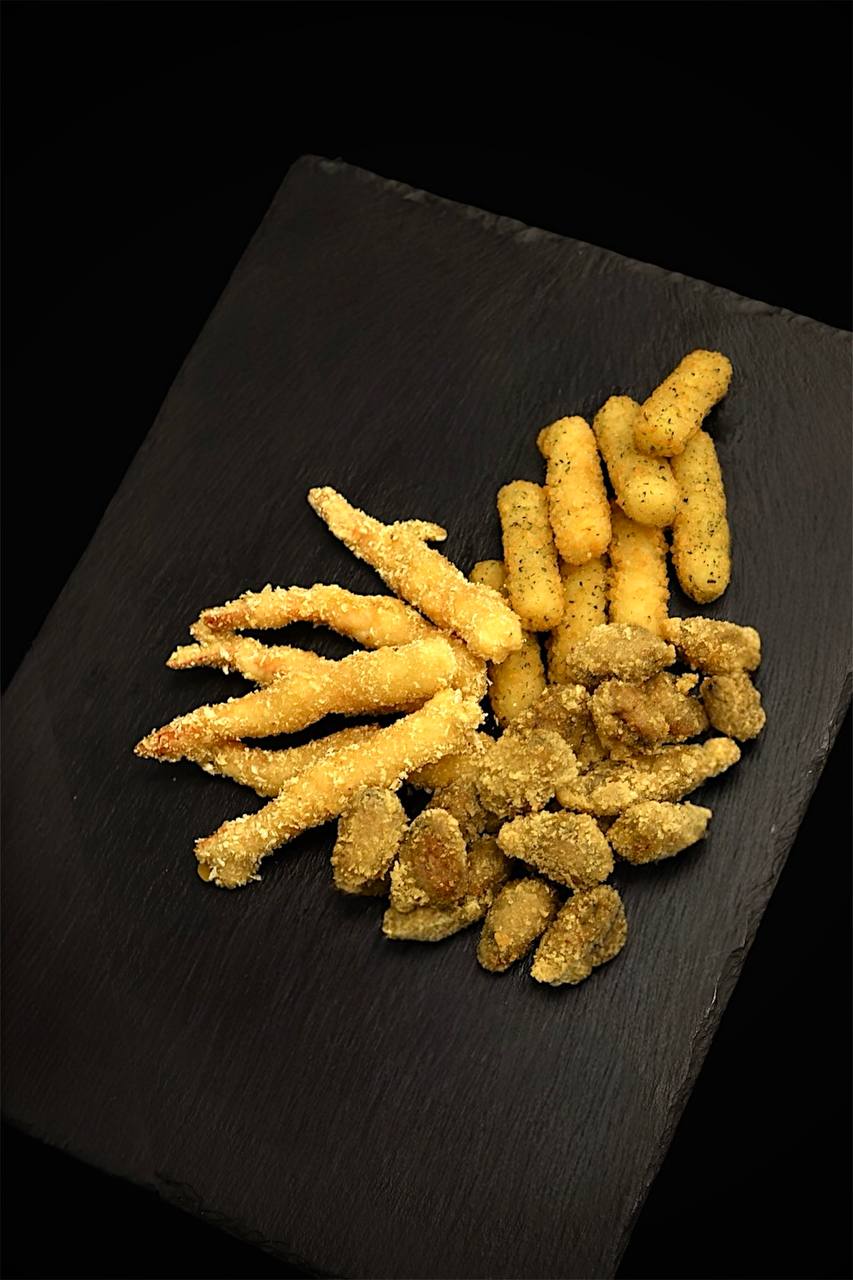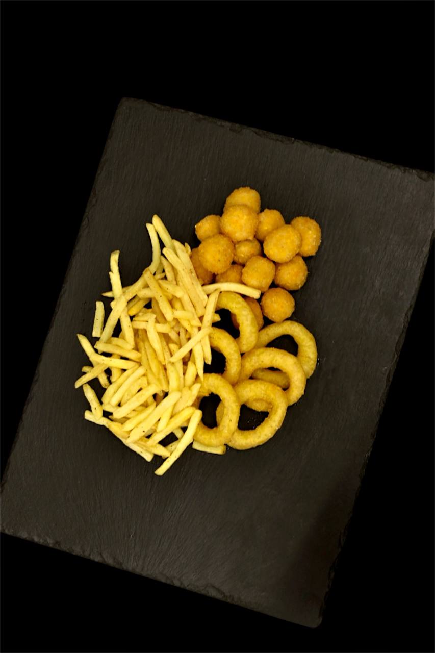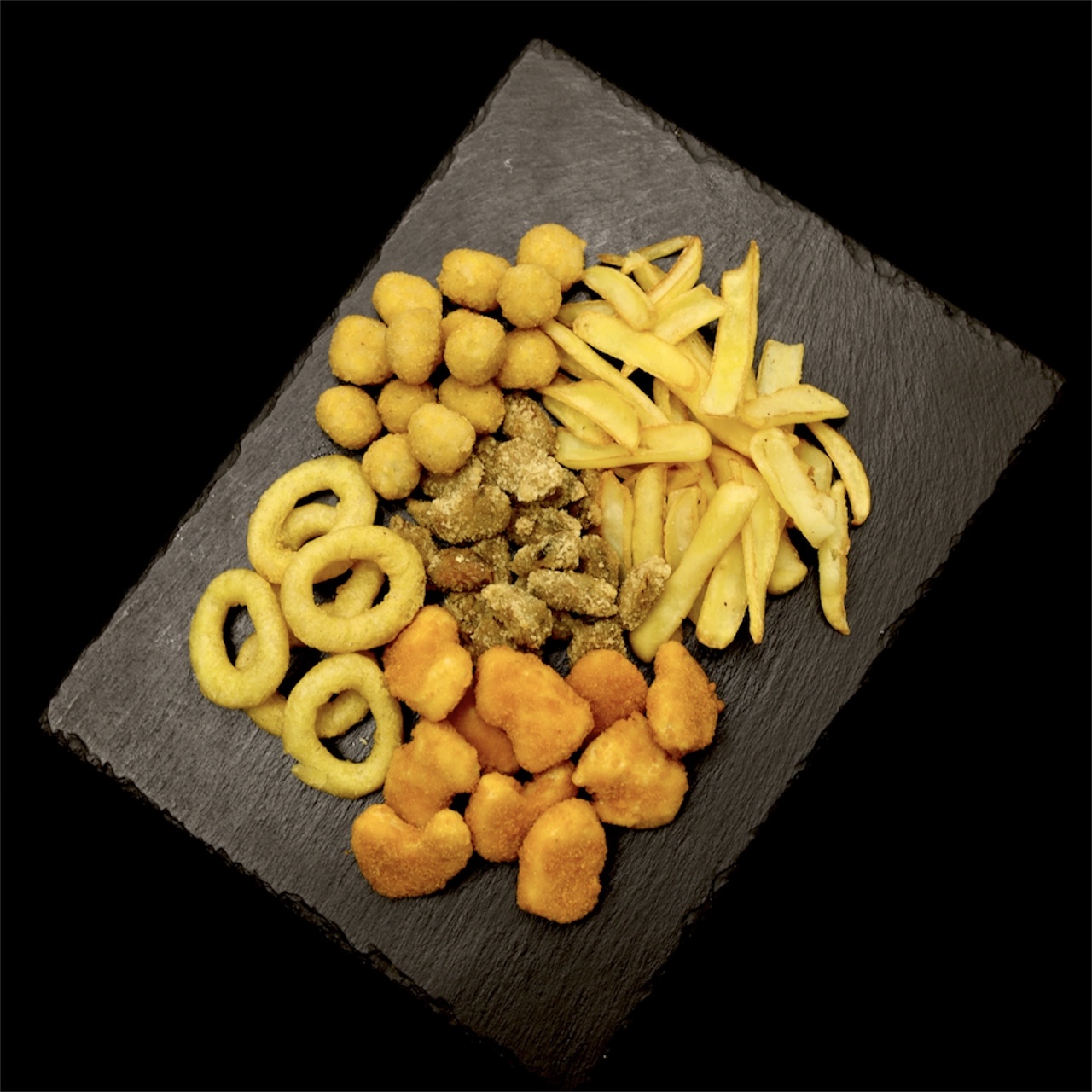 -Нагетси 10шт-Сирні кульки-Картопляні діпи-Мідія фрі-Кільця кальмаруВага 1100 грам